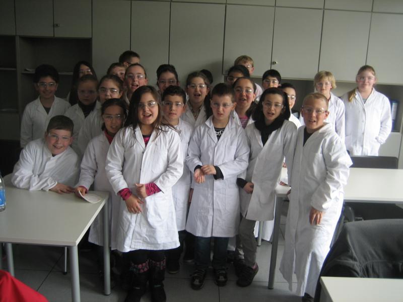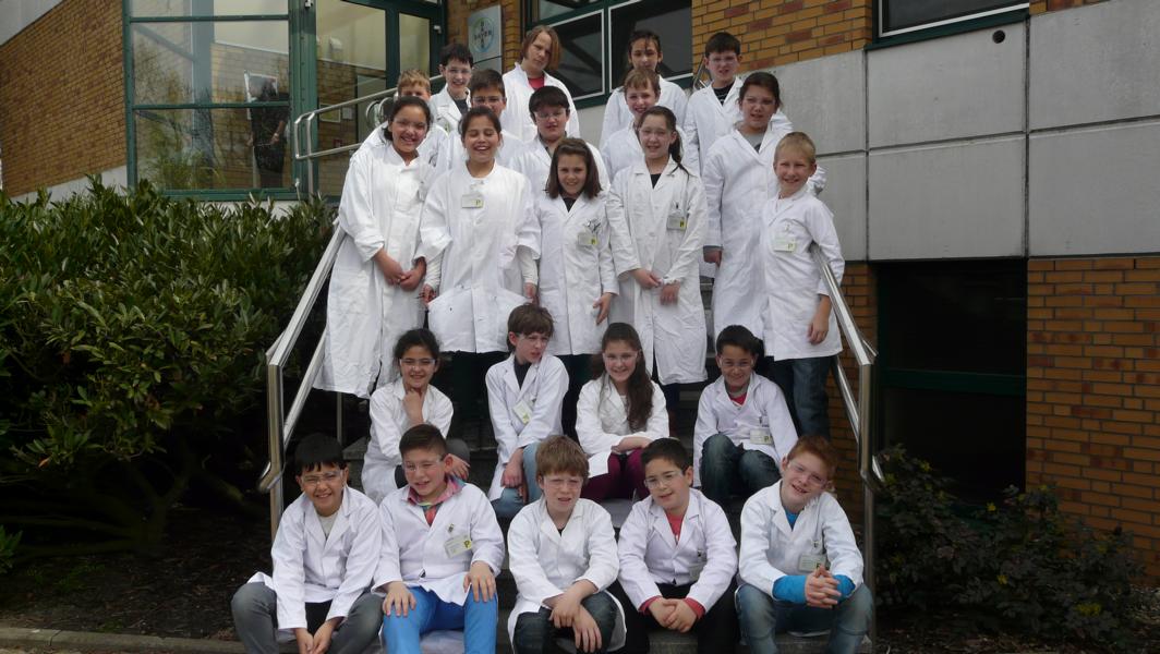 Am 16. und 17. April hatten die Klassen 4a und 4b die Gelegenheit, dem ortsansässigen Chemiewerk Bayer (früher Schering) einen Besuch abzustatten. Nach einem halbstündigen Fußmarsch bei schönstem Wetter wurden wir von zwei Chemielaboranten-Auszubildenden bereits am Werkstor in Empfang genommen. Zunächst bekam jeder einen Besucherausweis, ohne den niemand das Firmengelände betreten durfte. Wir wurden anschließend in einen Schulungsraum geführt, wo wir mit den Regeln, die in einem Labor gelten, vertraut gemacht wurden. Ausgestattet mit Schutzkitteln und Schutzbrillen nahmen wir dann aufgeregt unsere Plätze an den Labortischen ein. Vier Auszubildende führten uns nun durch einige interessante Versuche, die wir größtenteils selbst durchführen durften. So ließen wir durch das Pusten in eine rosa Flüssigkeit, die Farbe verschwinden. Mit Backpulver stellten wir einen Vulkanausbruch dar, wir reinigten verschmutzes Wasser, wir fanden heraus, dass in schwarzen Farbstiften viele Farben vorkommen und wir ließen Büroklammern auf dem Wasser schwimmen. Einige Experimente waren so gefährlich, dass sie nur von den erfahrenen Azubis demonstriert werden durften. Am besten gefiel uns in diesem Zusammenhang die Elefanten-Zahnpasta. Aber auch die permanent wiederkehrende Farbveränderung einer dunklen Flüssigkeit zu Rot und Gelb alleine durch Rühren und Wärme faszinierte uns. Alles in allem war der Vormittag im Ausbildungslabor bei Bayer eine interessante, lehrreiche Veranstaltung. Die Klassen 4a und 4b möchten sich dafür noch einmal ausdrücklich bei den Auszubildenden sowie bei den Verantwortlichen der Firma Bayer bedanken, die den Kindern der GHS den Einblick in die Arbeitswelt ermöglicht haben.